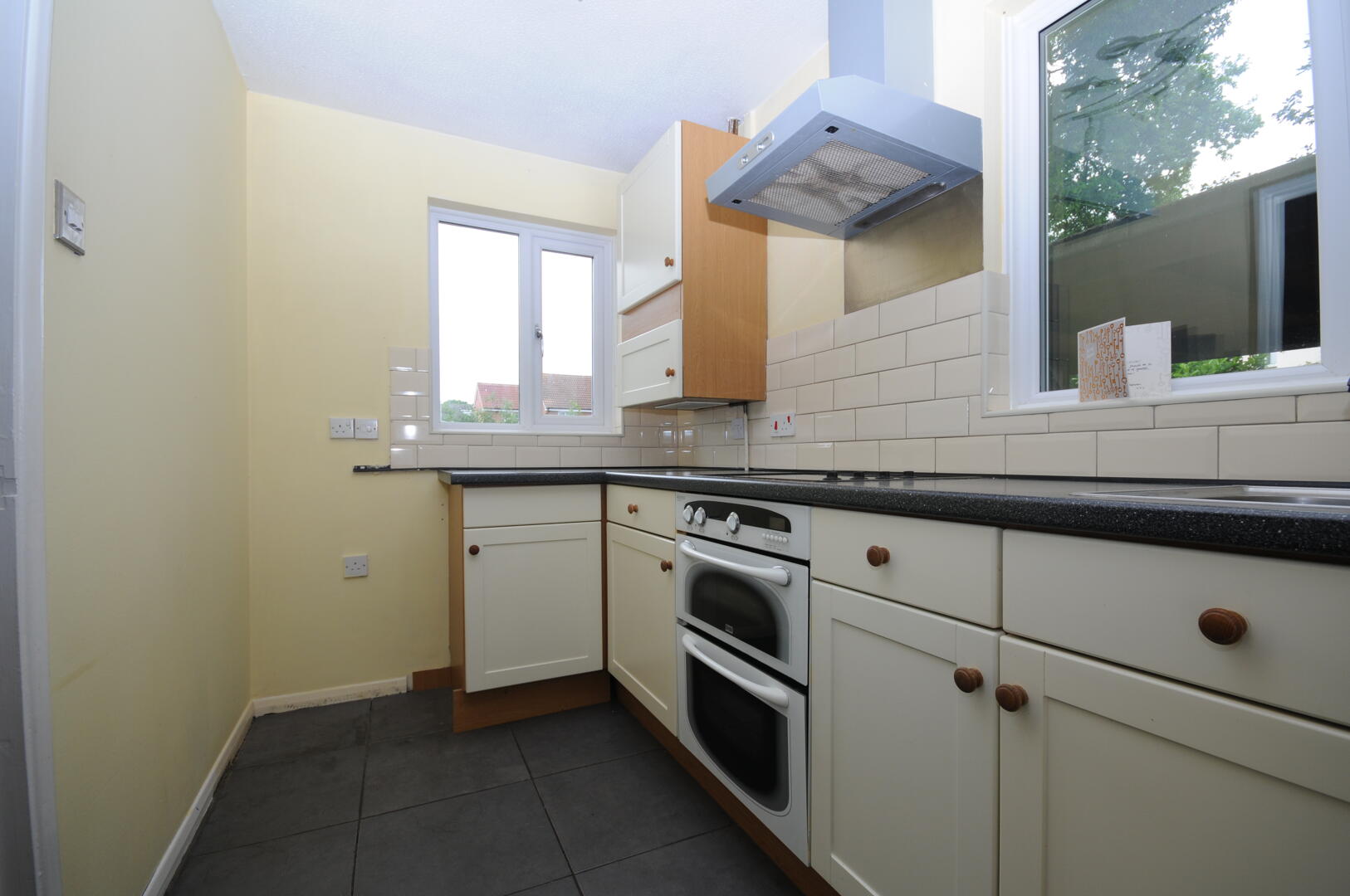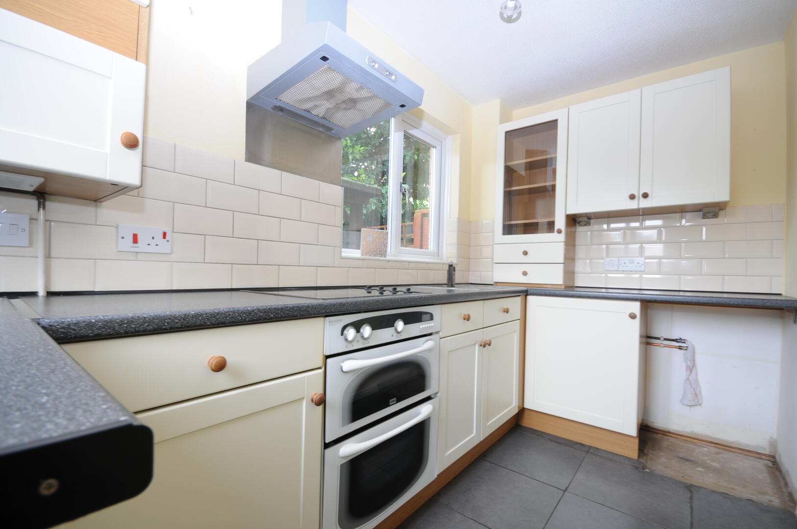 The kitchen is thoughtfully designed with a range of cream cabinetry topped with dark work surfaces. It includes an integrated oven and hob, complemented by a tiled splashback and a window that looks outside, creating a practical and bright space for cooking.