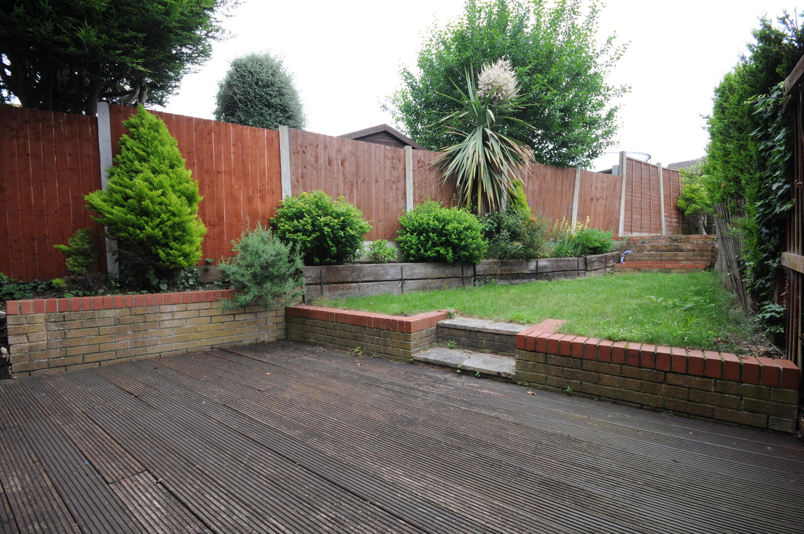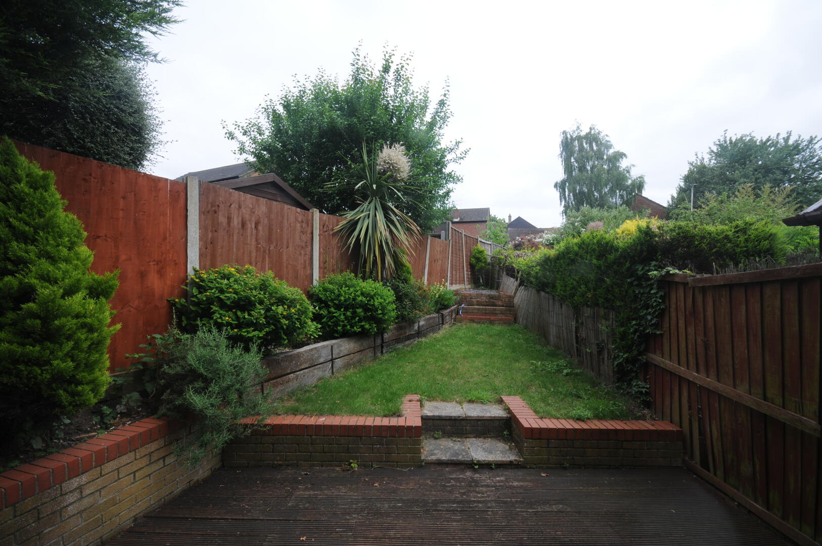 The garden offers a delightful outdoor space with a raised decking area ideal for seating and relaxing. Steps lead up to a well-maintained lawn bordered by mature shrubs and trees, providing privacy and a pleasant green outlook.