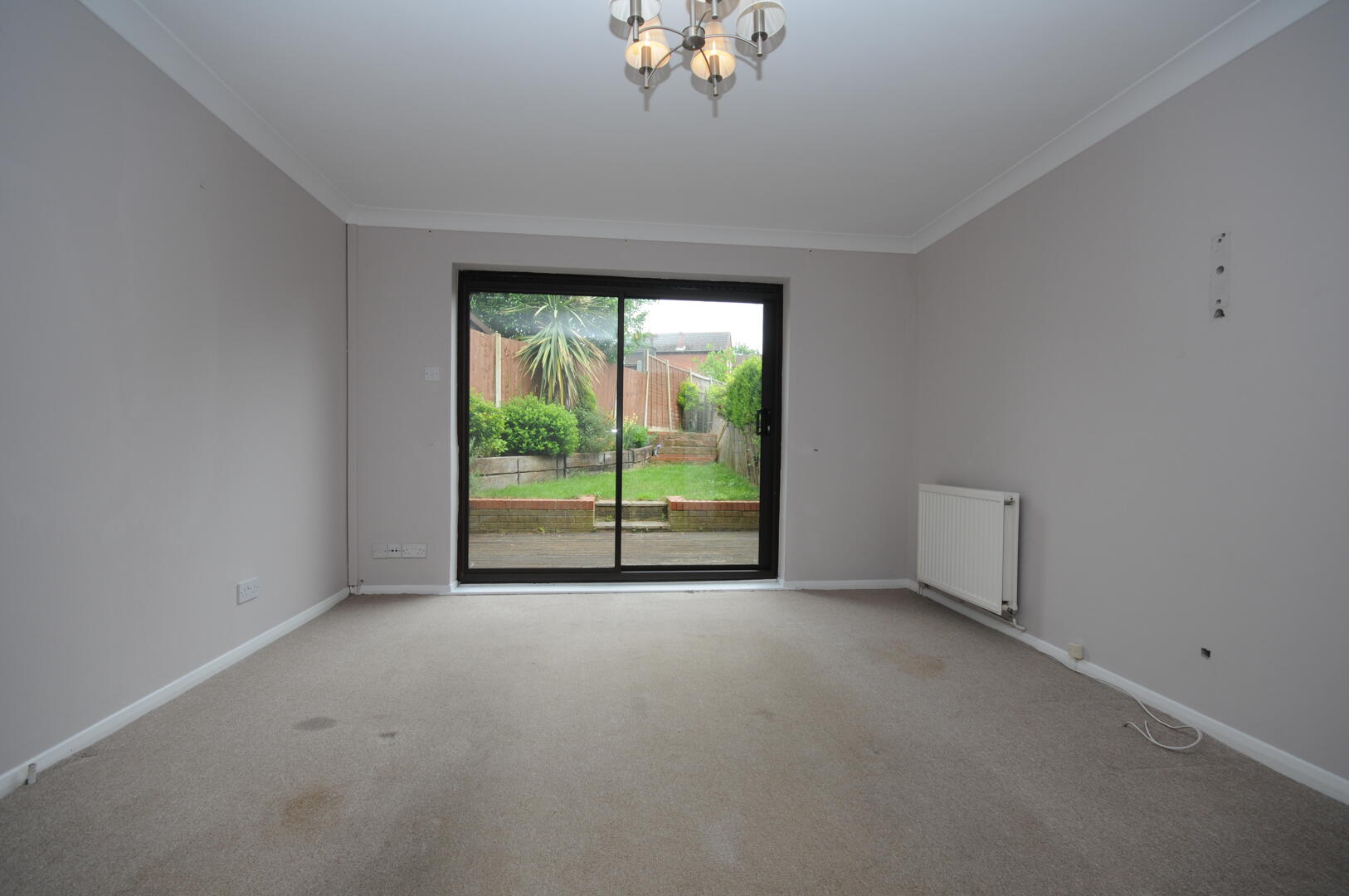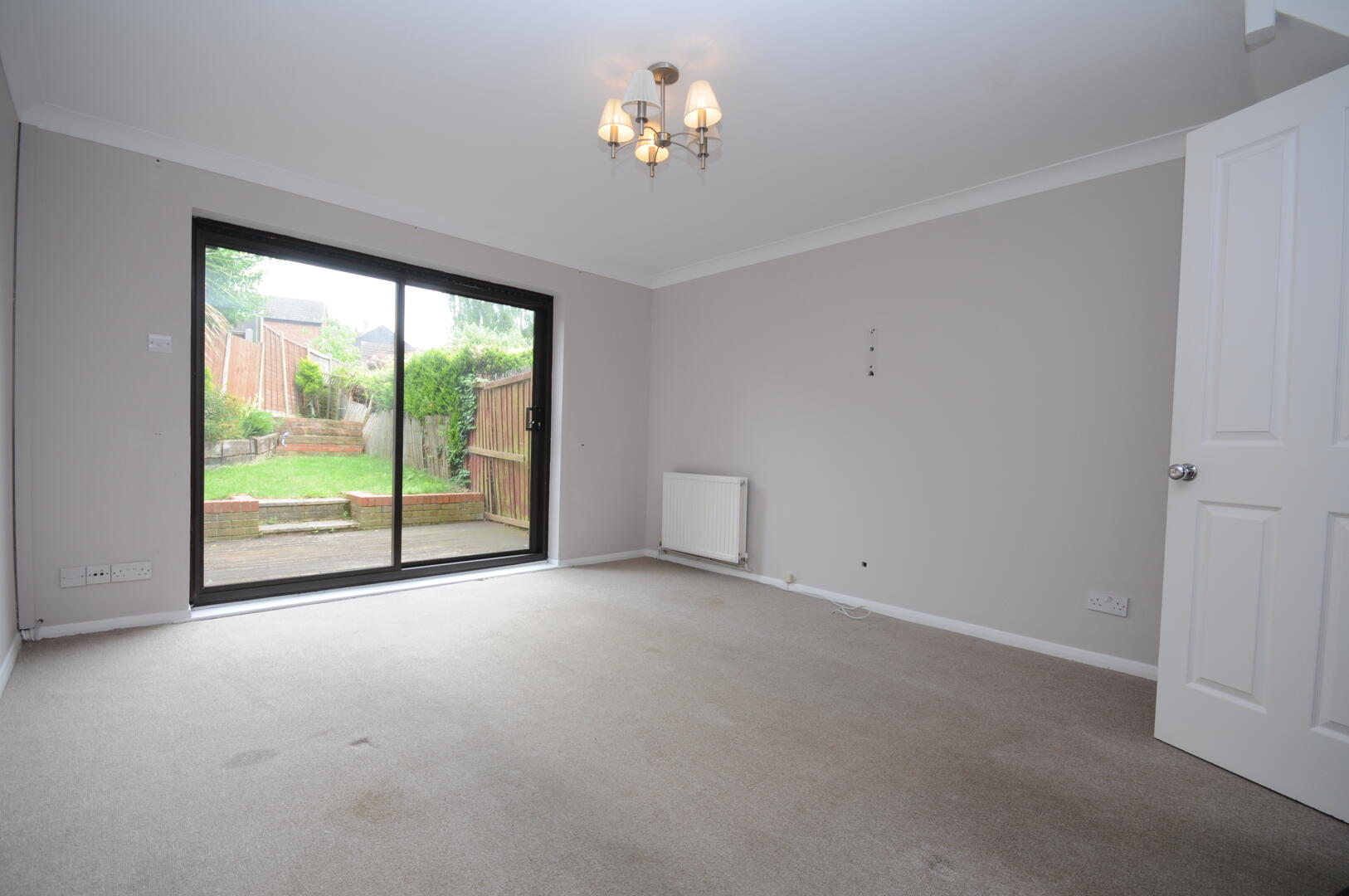 This welcoming lounge provides a spacious area for relaxation and entertaining, featuring a large sliding door that opens out to the garden, allowing natural light to flood the room. The neutral décor and carpeted floor create a comfortable and versatile living space.