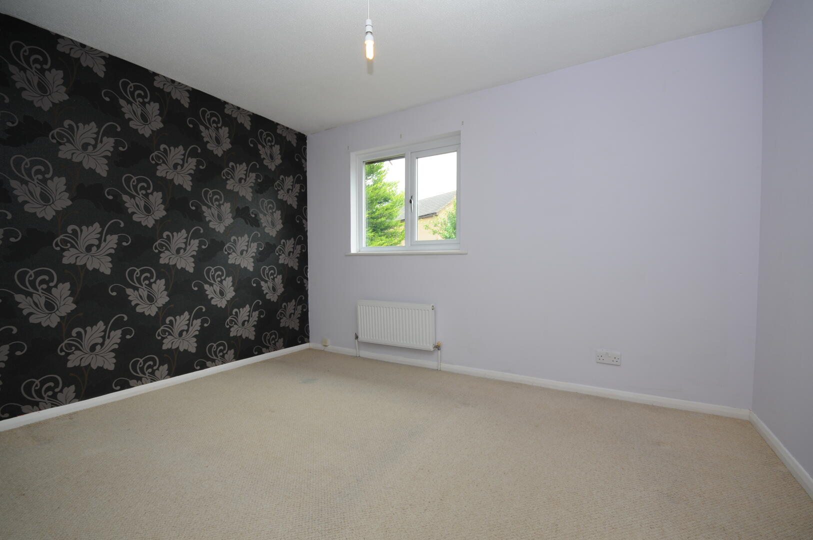 This bedroom offers a calm and restful environment, featuring a lightly patterned wallpaper on one wall and soft carpeting underfoot. A window allows natural light to enter, enhancing the tranquil atmosphere.