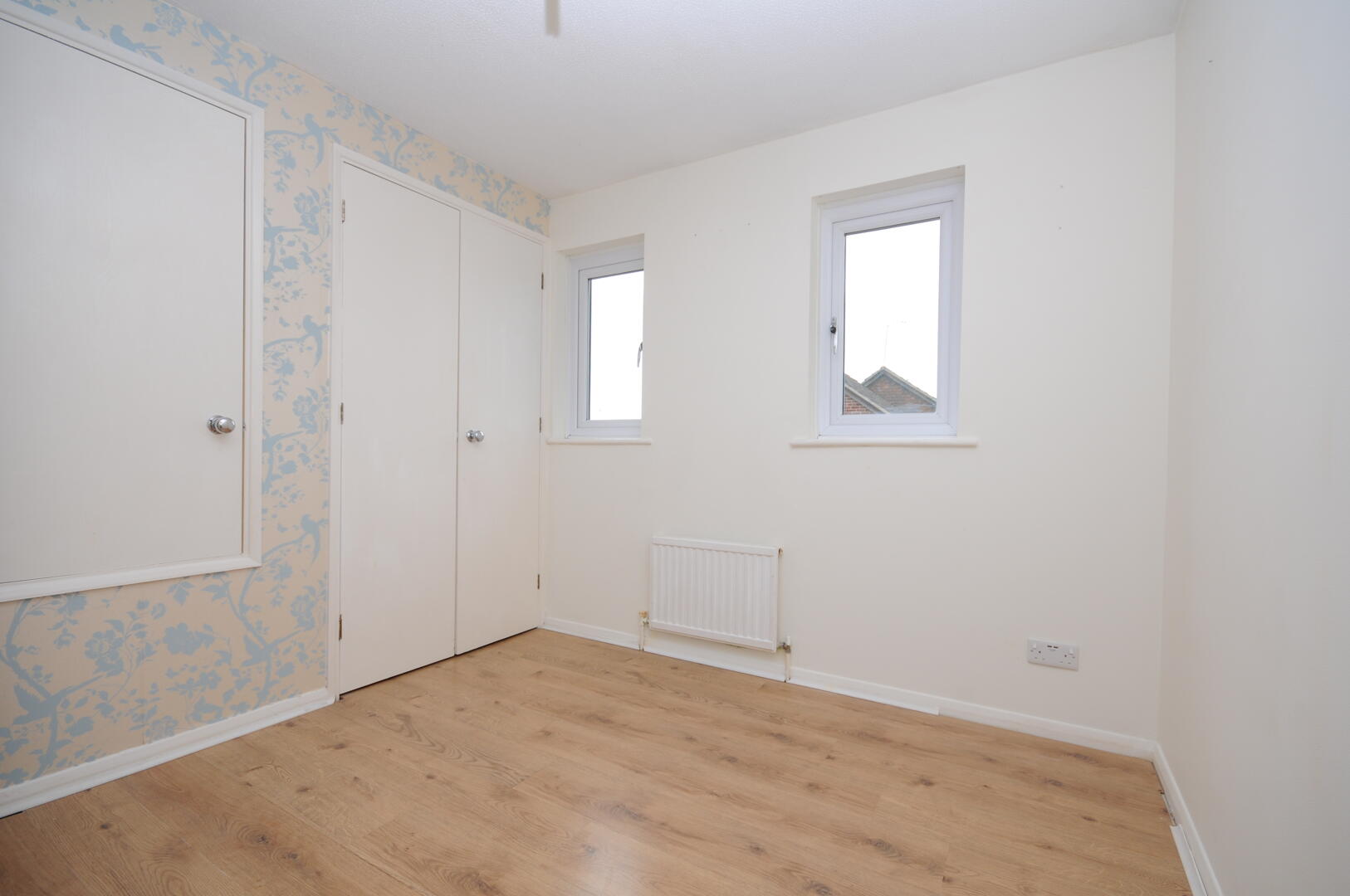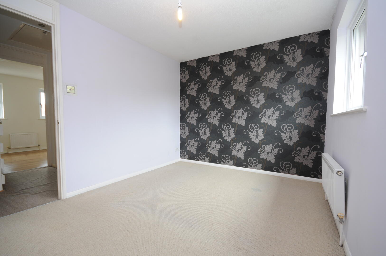 A cosy second bedroom with light walls and neutral carpeting, complemented by storage options including a built-in wardrobe. This room benefits from a window that fills the space with natural light, creating a bright and airy feel.