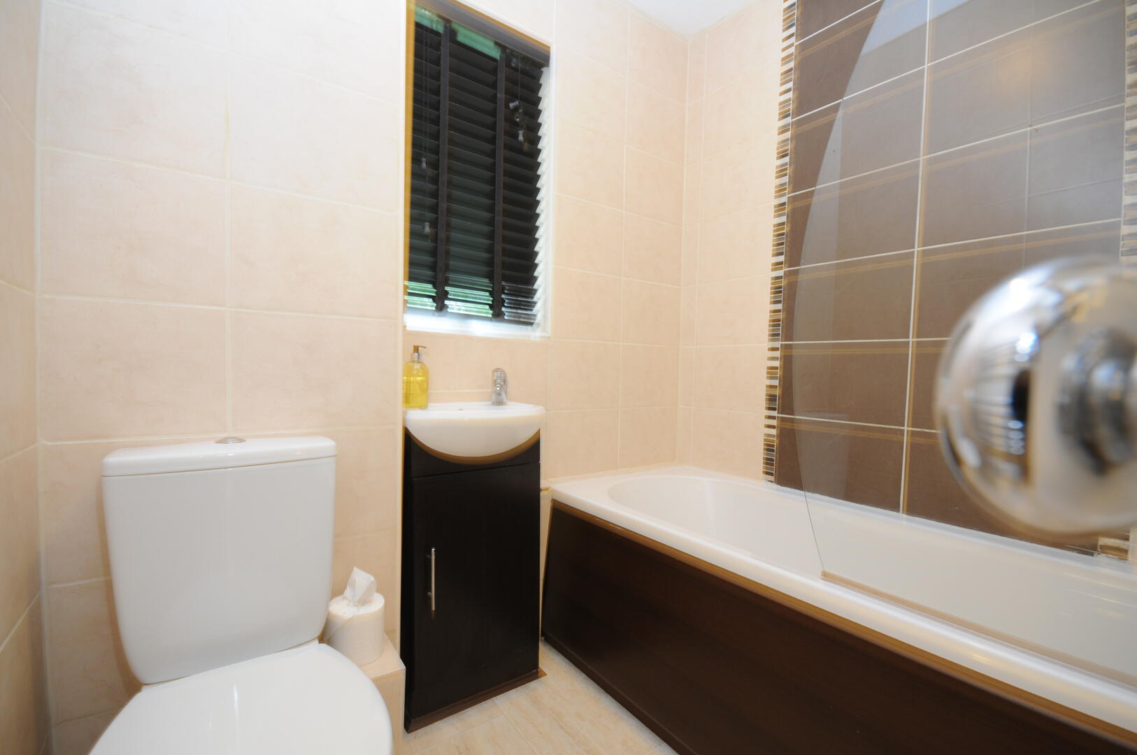 The bathroom features a classic suite with a bath and shower over, a toilet, and a vanity unit with a sink. The pale tiling and a window with blinds ensure the room feels light and fresh while maintaining privacy.