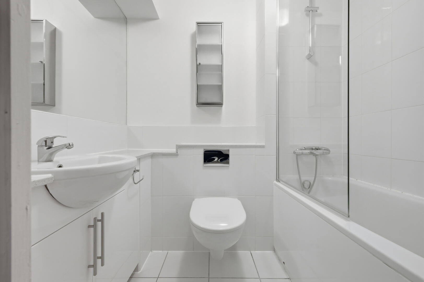 This bathroom is similarly bright and tiled in white, featuring a bath with a glass shower screen, a wall-mounted toilet, and a sink with integrated storage beneath. The layout is practical and clean, making good use of the available space.