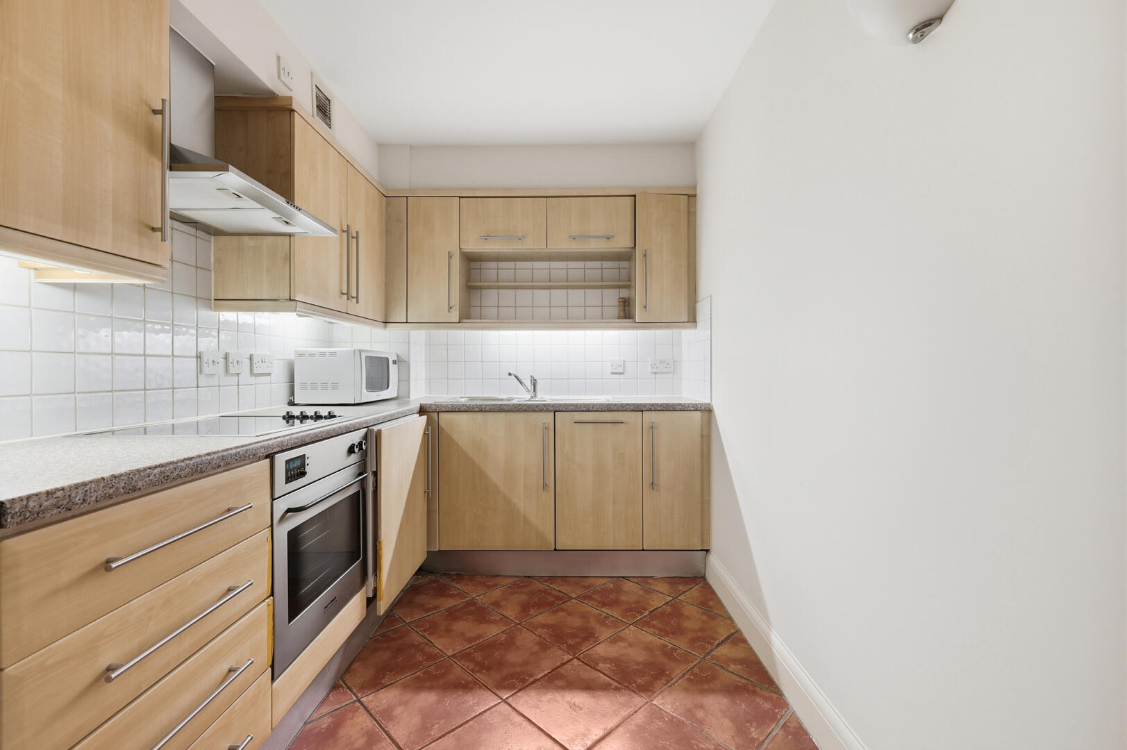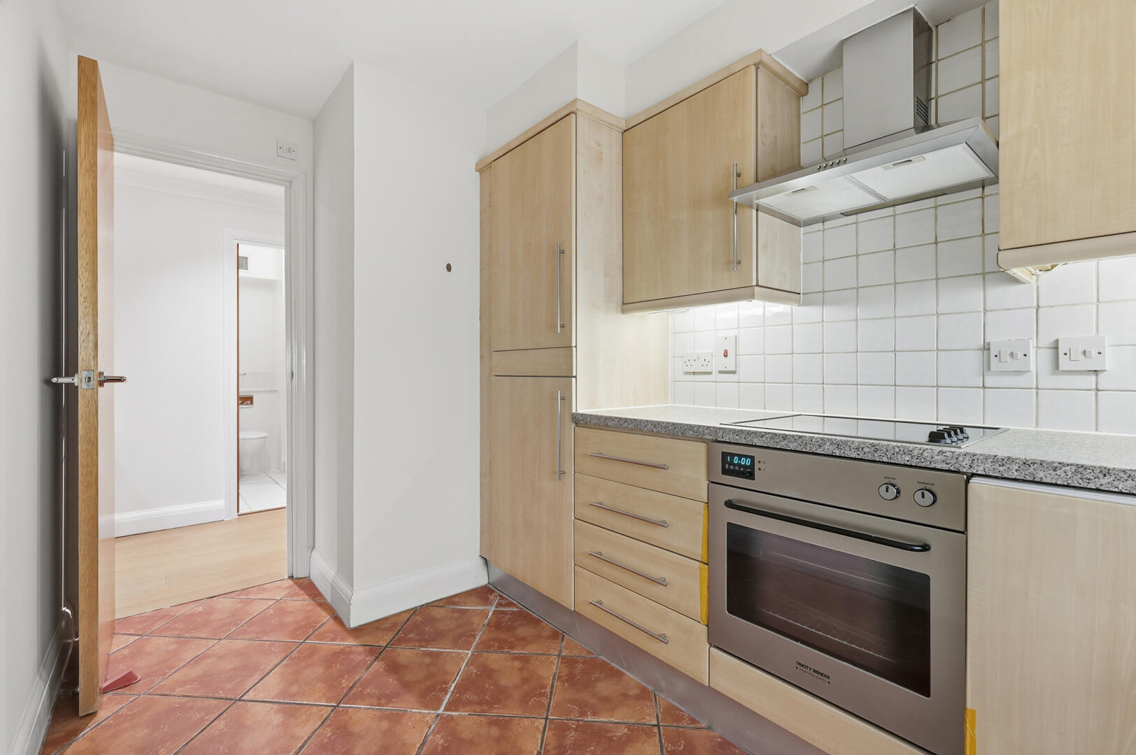 The kitchen is neatly arranged with a range of light wood cabinets providing good storage, complemented by practical tiled flooring in a warm terracotta shade. Work surfaces surround the kitchen area, with integrated appliances including an oven and hob beneath an extractor fan. The white tiled splashbacks and under-cabinet lighting create a clean and functional cooking space.