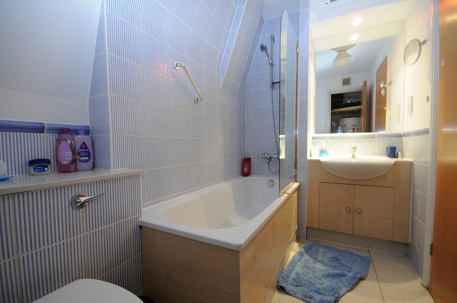 The bathroom is equipped with a bath and overhead shower, with tiling in a light colour that enhances the sense of cleanliness and brightness. A built-in vanity unit below the sink provides storage, and a large mirror helps to open up the space. The bathroom floor is tiled and the layout makes good use of the available space.