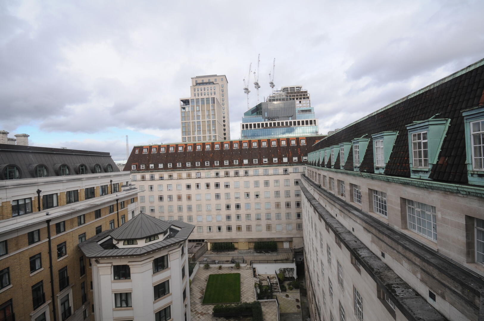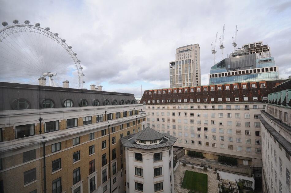 The views from the property look out across a courtyard surrounded by period buildings, offering a quiet and somewhat elevated perspective. Some greenery is visible within the courtyard, lending a touch of nature to the urban setting. In the distance, notable London landmarks including the London Eye can be seen, adding to the appeal of this city centre location.