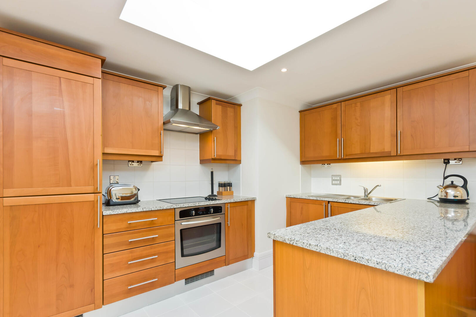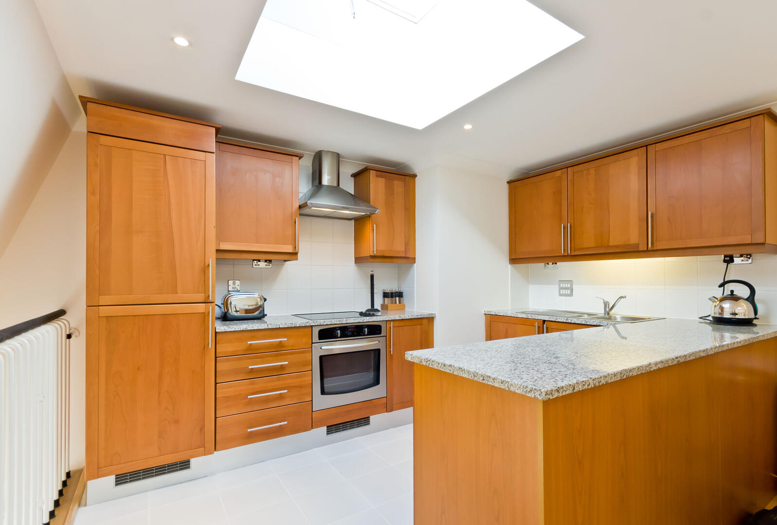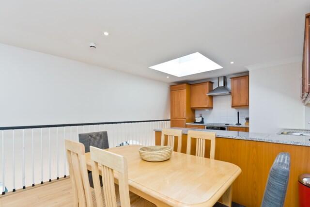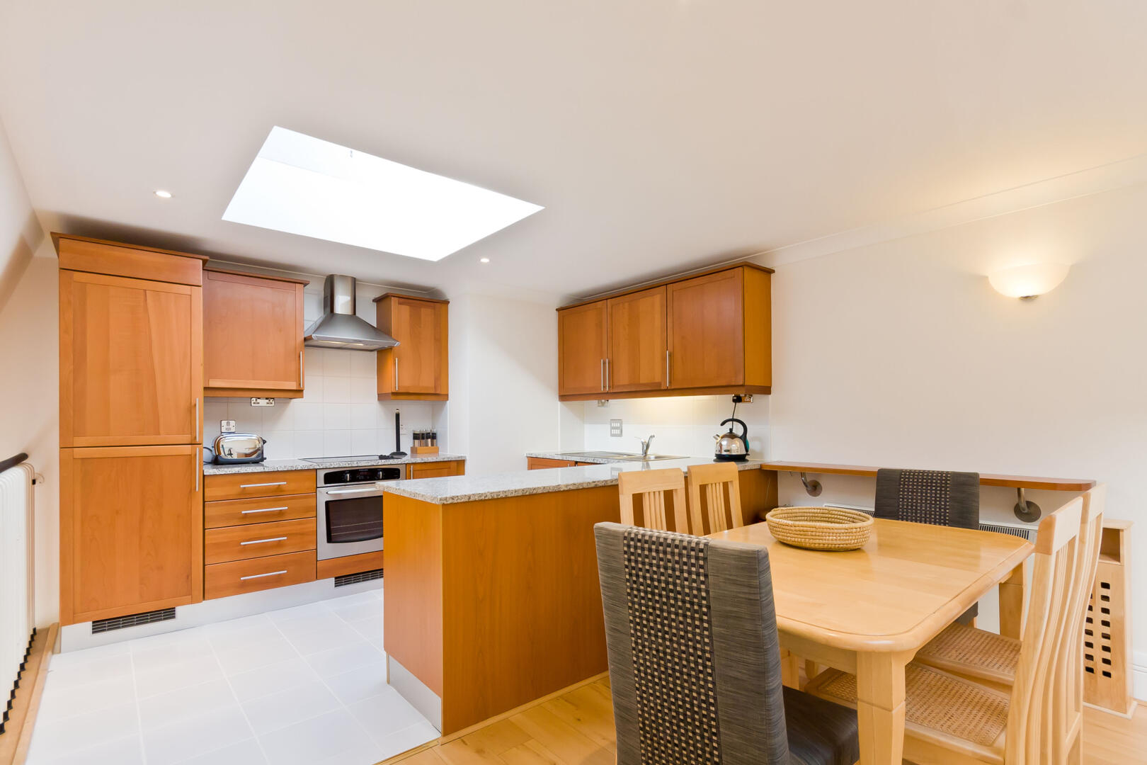 The kitchen and dining area is bright and airy thanks to skylights that flood the space with natural light. It features warm wooden cabinetry paired with sleek granite countertops, providing ample storage and workspace. The layout includes a central island and a wooden dining table that comfortably seats six, making it ideal for both cooking and casual dining. The light wooden flooring complements the cabinetry and adds to the welcoming feel of this well-appointed space.