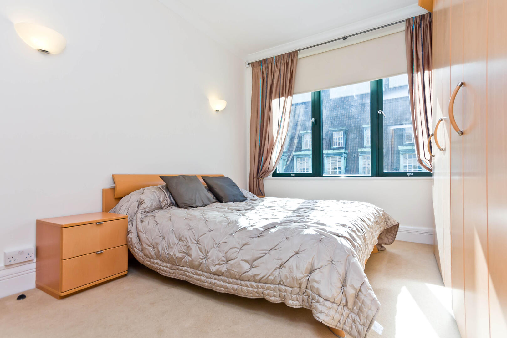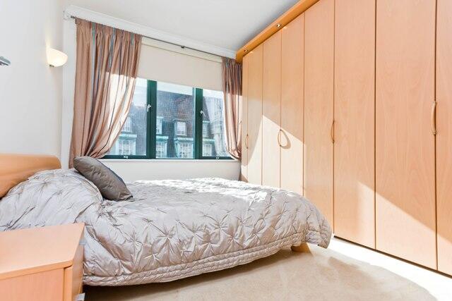 Two bedrooms are shown, each offering a peaceful retreat with large windows that fill the rooms with natural daylight. One bedroom features expansive built-in wardrobes with light wood finish providing excellent storage, alongside a neutral carpet that complements the soft furnishings. The other bedroom is simply styled with a wooden bed frame and light carpet, perfect for rest and relaxation. Both rooms have a calm, neutral palette and plenty of space for personal touches.