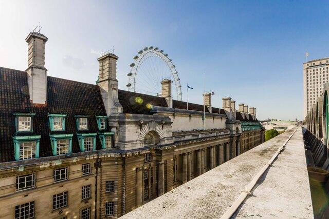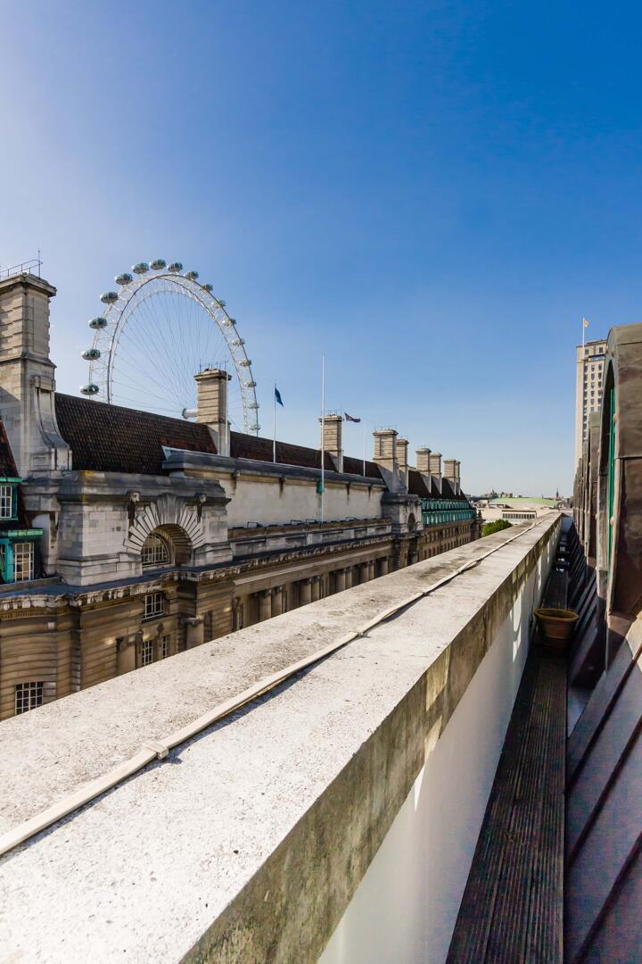 The property boasts stunning views from its balcony or terrace, overlooking elegant period buildings with distinctive architectural details. The iconic London Eye is visible in the distance, enhancing the sense of place and offering a captivating cityscape to enjoy from the comfort of home.