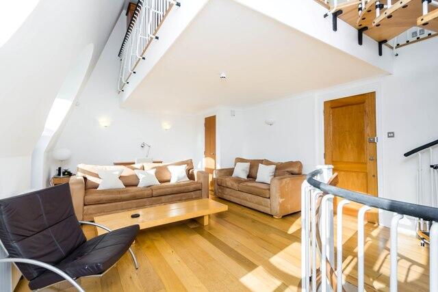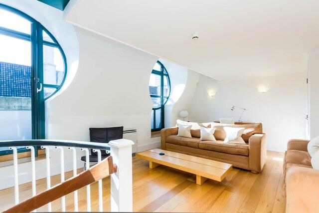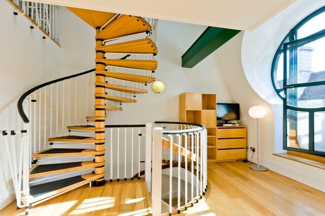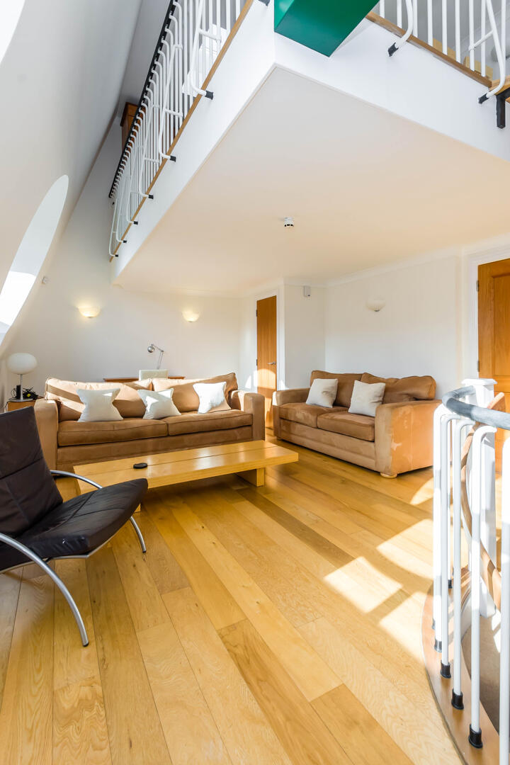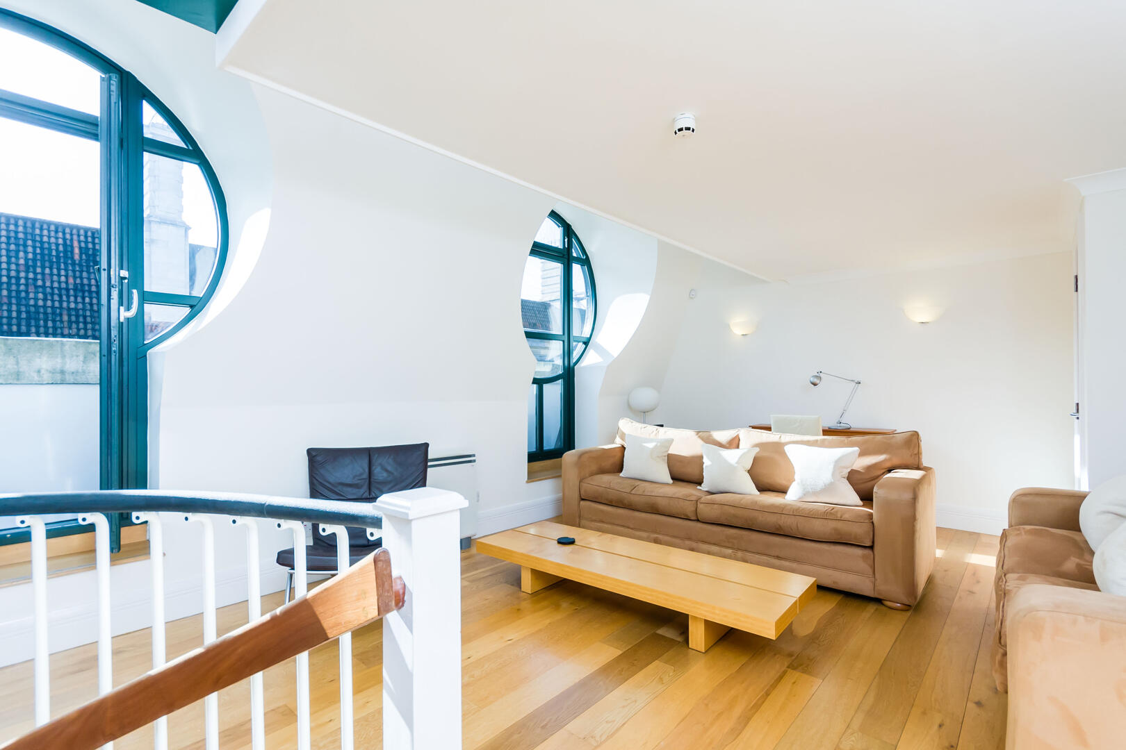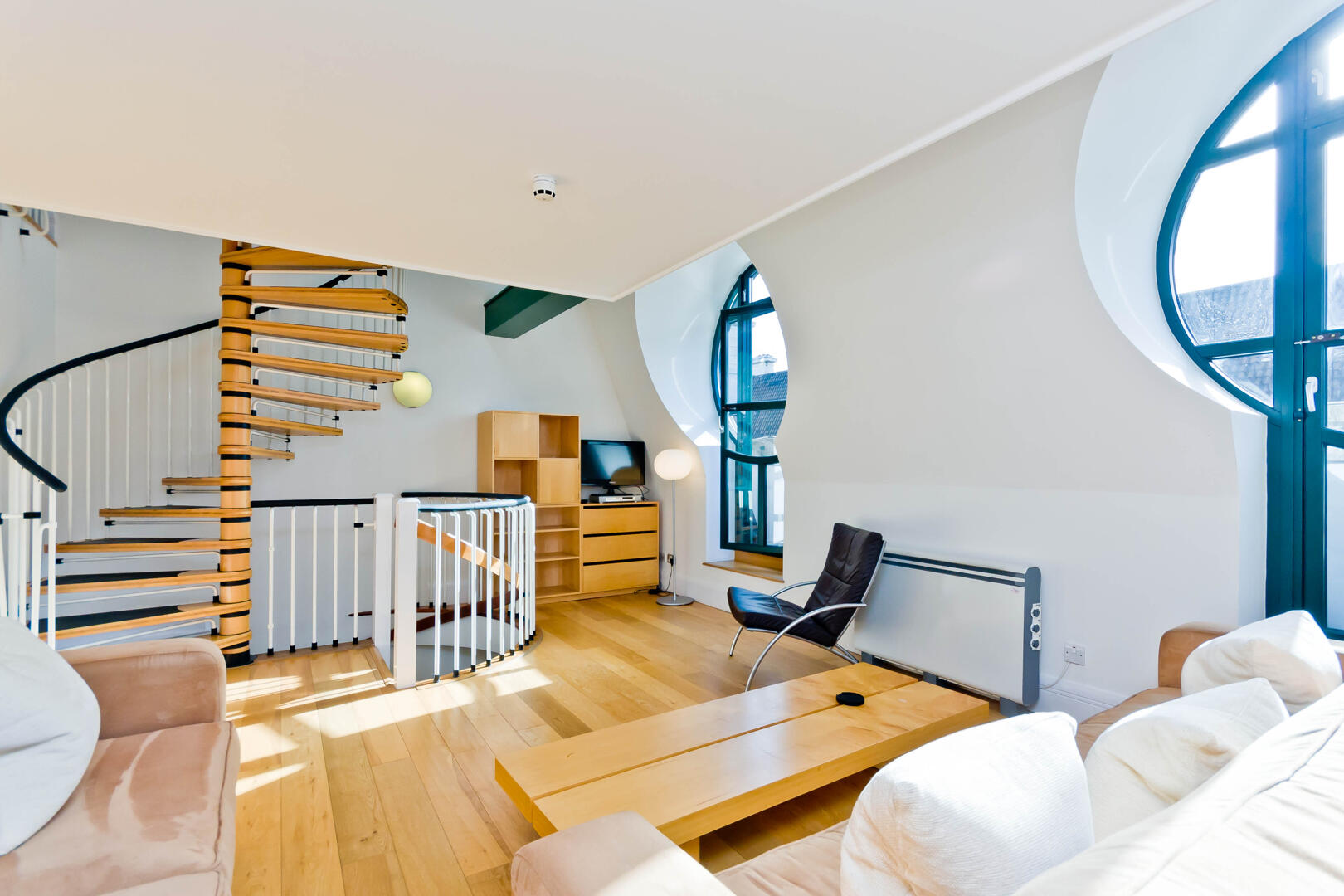 This bright reception room features a unique spiral staircase with wooden treads and black railings, adding architectural interest. The space benefits from circular windows that lend an abundance of natural light and distinctive character. The wooden flooring and neutral walls create a warm and inviting atmosphere, complemented by a simple yet stylish arrangement of sofas and chairs that encourage relaxation and socialising.