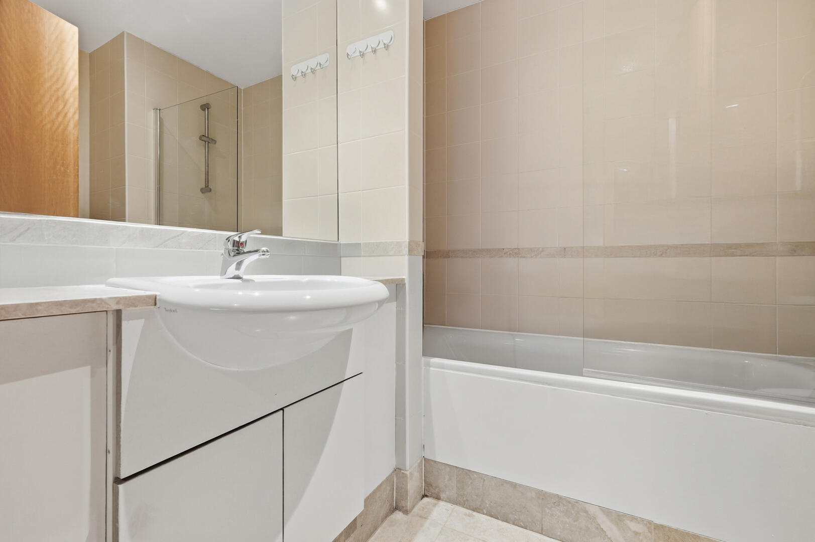 The bathroom is fitted with a white suite including a bathtub with a glass screen, a toilet, and a wash basin set into a vanity unit with storage beneath. The walls feature large beige tiles that continue around the bath area, complementing the neutral tiled floor for a clean and contemporary look.