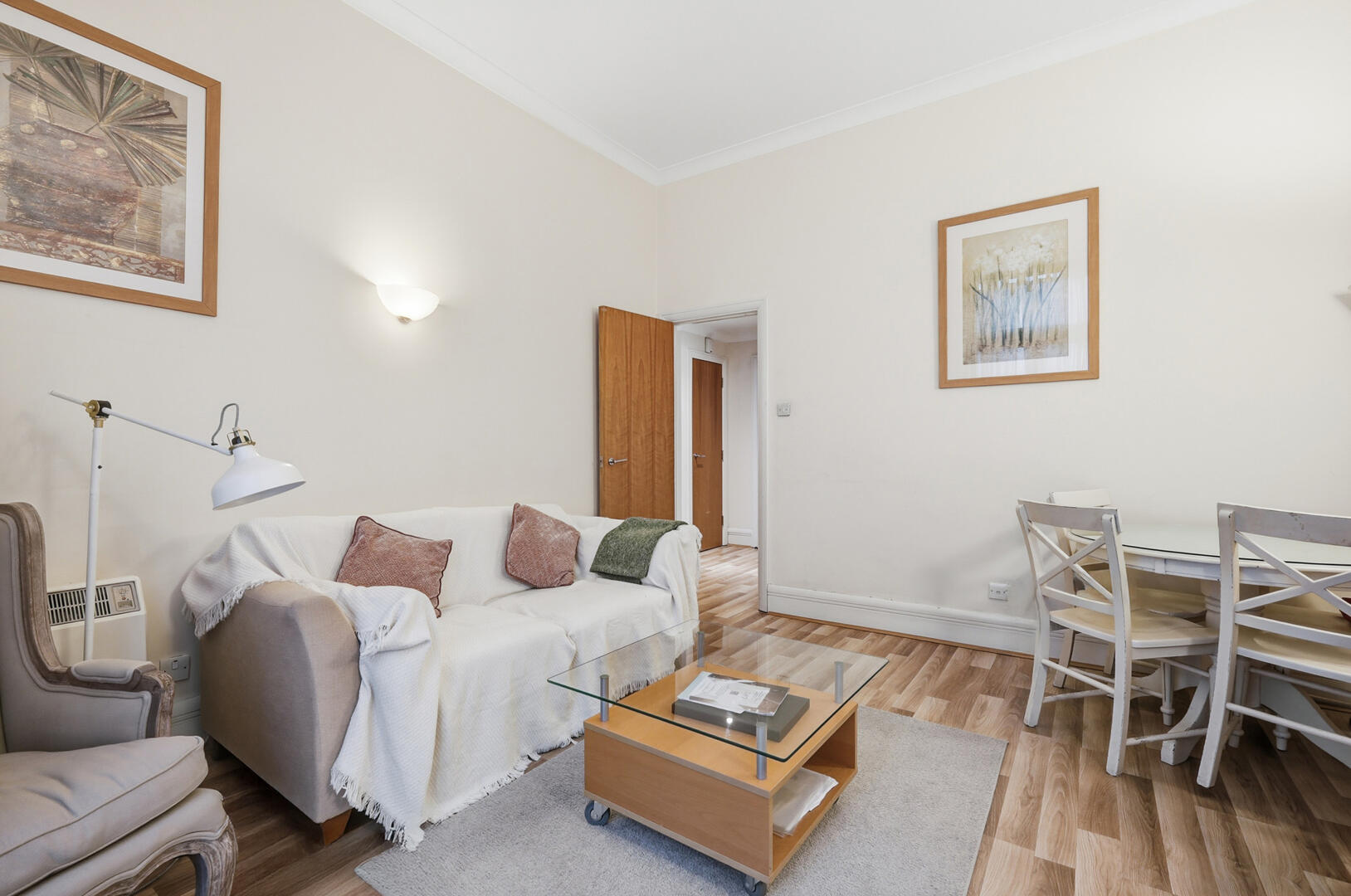 This inviting reception room features a bright and airy atmosphere thanks to large double doors that open to a balcony, flooding the space with natural light. It offers a comfortable seating area with a sofa and armchair, paired with a glass coffee table and a small dining area with a table and chairs, ideal for enjoying meals or entertaining guests. The neutral walls and wood-effect flooring create a warm and versatile backdrop, making this room perfect for relaxing or socialising.