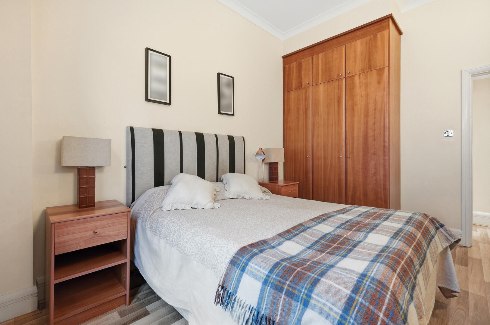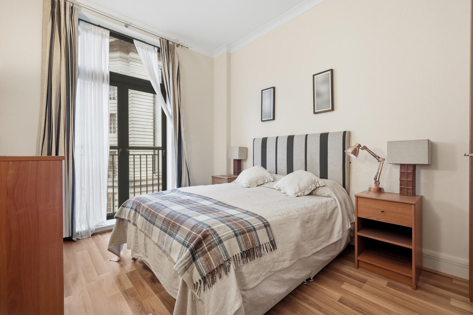 This bedroom is a restful retreat with a calming and clean aesthetic. It features a double bed with a striped upholstered headboard, flanked by two bedside tables with matching lamps. A built-in wardrobe with wooden doors provides ample storage, while the floor-to-ceiling double doors open onto a balcony, offering plenty of natural light and fresh air. The soft wood flooring and neutral walls add to the tranquil feel of the room.
