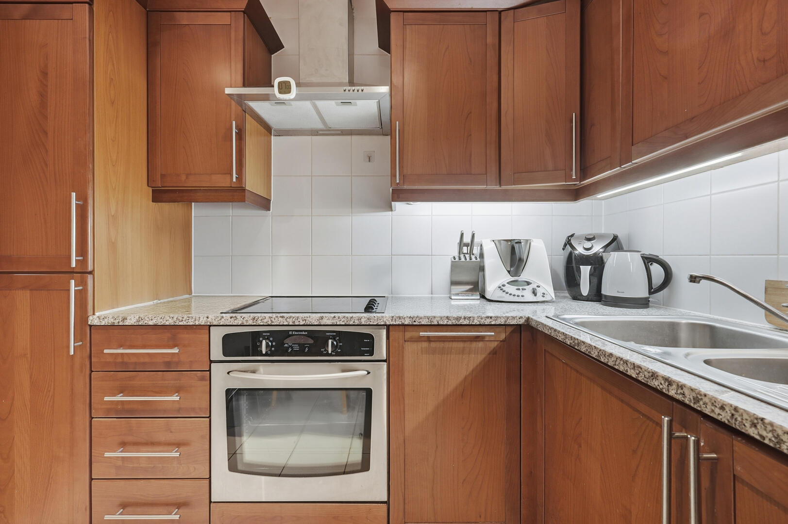 The kitchen is neatly laid out in a compact, efficient design with plentiful wooden cabinetry and a granite-effect work surface. It includes integrated appliances such as an oven, hob, and extractor hood, alongside a stainless-steel sink. The white tiled splashback and floor tiles create a clean and practical area for cooking, with enough space for small appliances and preparation tasks.