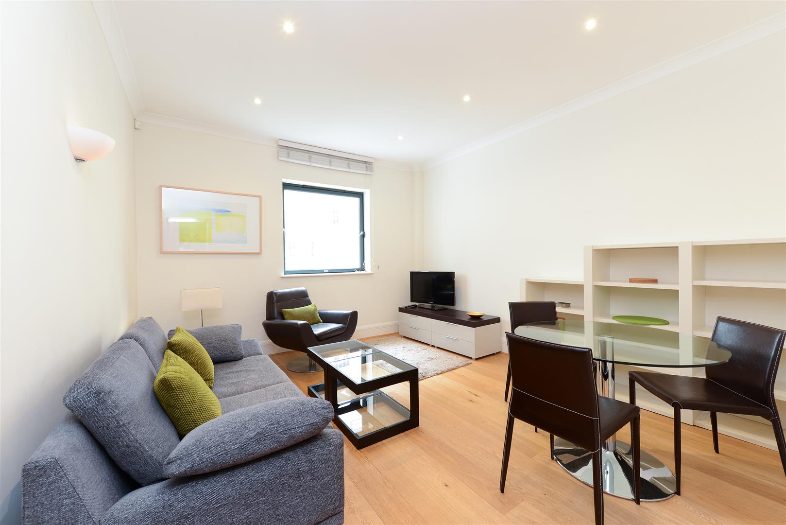 This welcoming reception and dining room offers a bright and airy space with natural light pouring in through a generously sized window. It features sleek wooden flooring and a comfortable seating area with a sofa and armchair, complemented by a glass coffee table. A compact dining area includes a small round table with chairs, and shelving along the wall adds practical storage or display space. The room is finished with neutral walls and modern recessed lighting, creating a versatile and inviting environment for relaxing or entertaining.