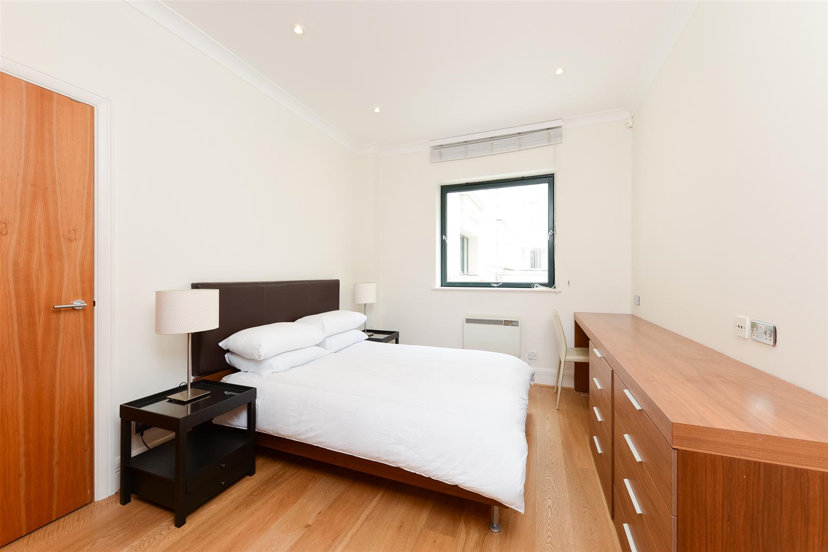 This bedroom features a spacious layout with wooden flooring and a large window that fills the room with natural light. Furnished simply with a double bed, bedside tables, and a long chest of drawers, the room feels peaceful and uncluttered. Neutral walls and recessed lighting complete the calm and restful ambiance, making it an ideal private retreat.