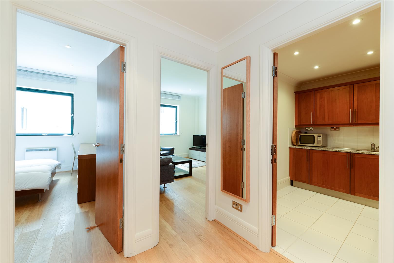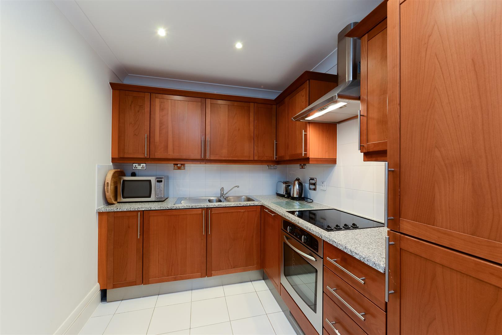 The kitchen is well-appointed with warm wooden cabinetry and granite worktops, providing plenty of storage and workspace. It is equipped with modern appliances including an oven, hob, and microwave. The tiled floor ensures easy maintenance, while the compact layout maximises efficiency for cooking and meal preparation.
