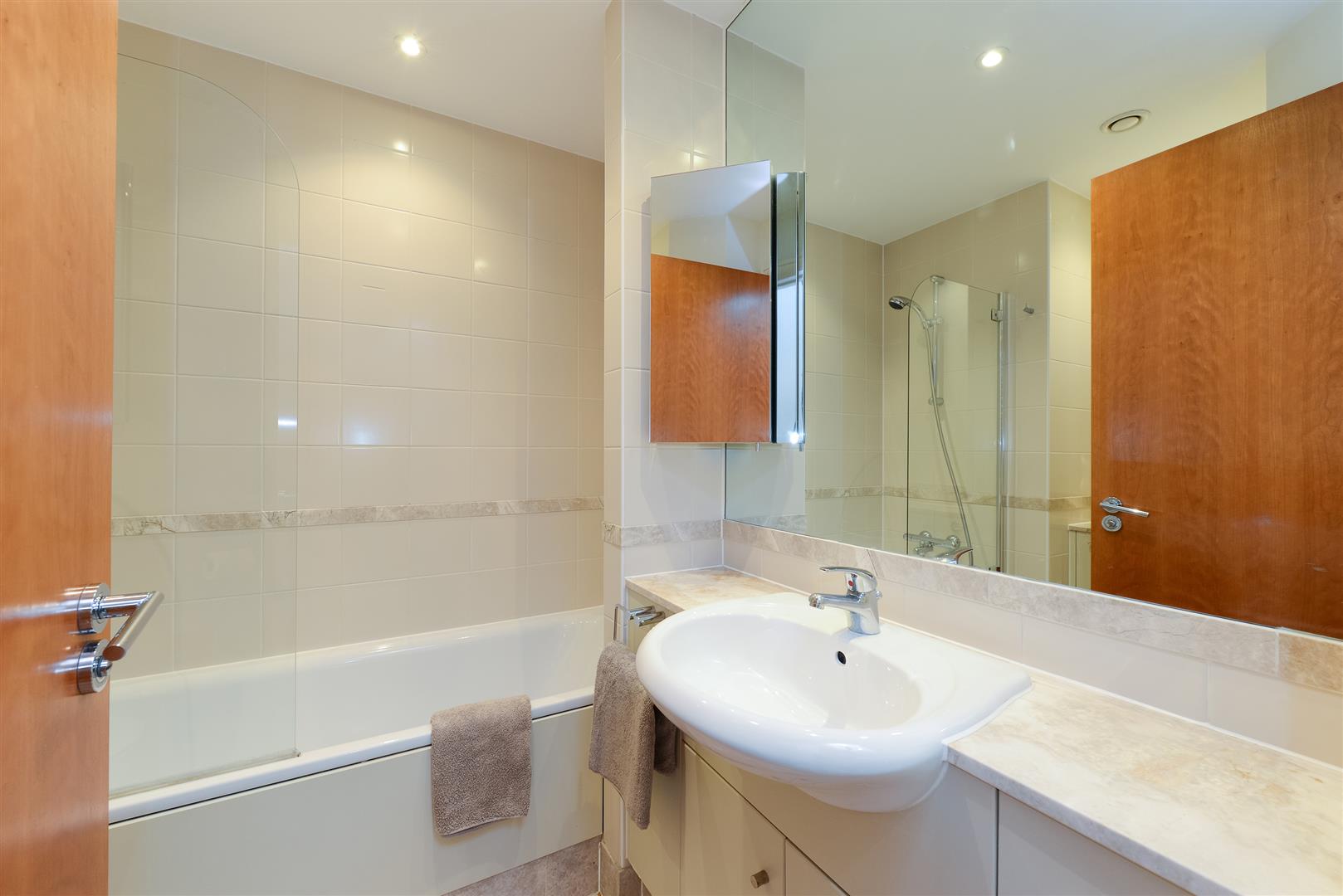 This bathroom offers a clean and contemporary design with tiled walls and floors. It includes a bath with a shower attachment, a modern washbasin set into a marble-effect vanity unit, and a mirror above. The neutral tones create a fresh and calming atmosphere, making it a comfortable space for daily use.