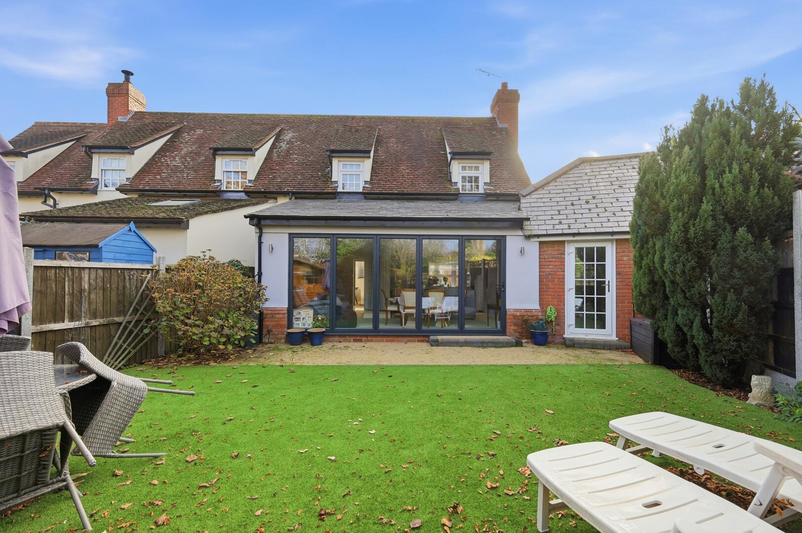 The rear garden is a delightful outdoor space with a well-maintained lawn bordered by mature trees and shrubs, creating a sense of privacy and tranquillity. A paved patio area provides an ideal spot for dining or relaxing outdoors, while a garden shed offers useful storage. The garden is enclosed by fencing and has ample room for seating and sun loungers, perfect for enjoying sunny days.