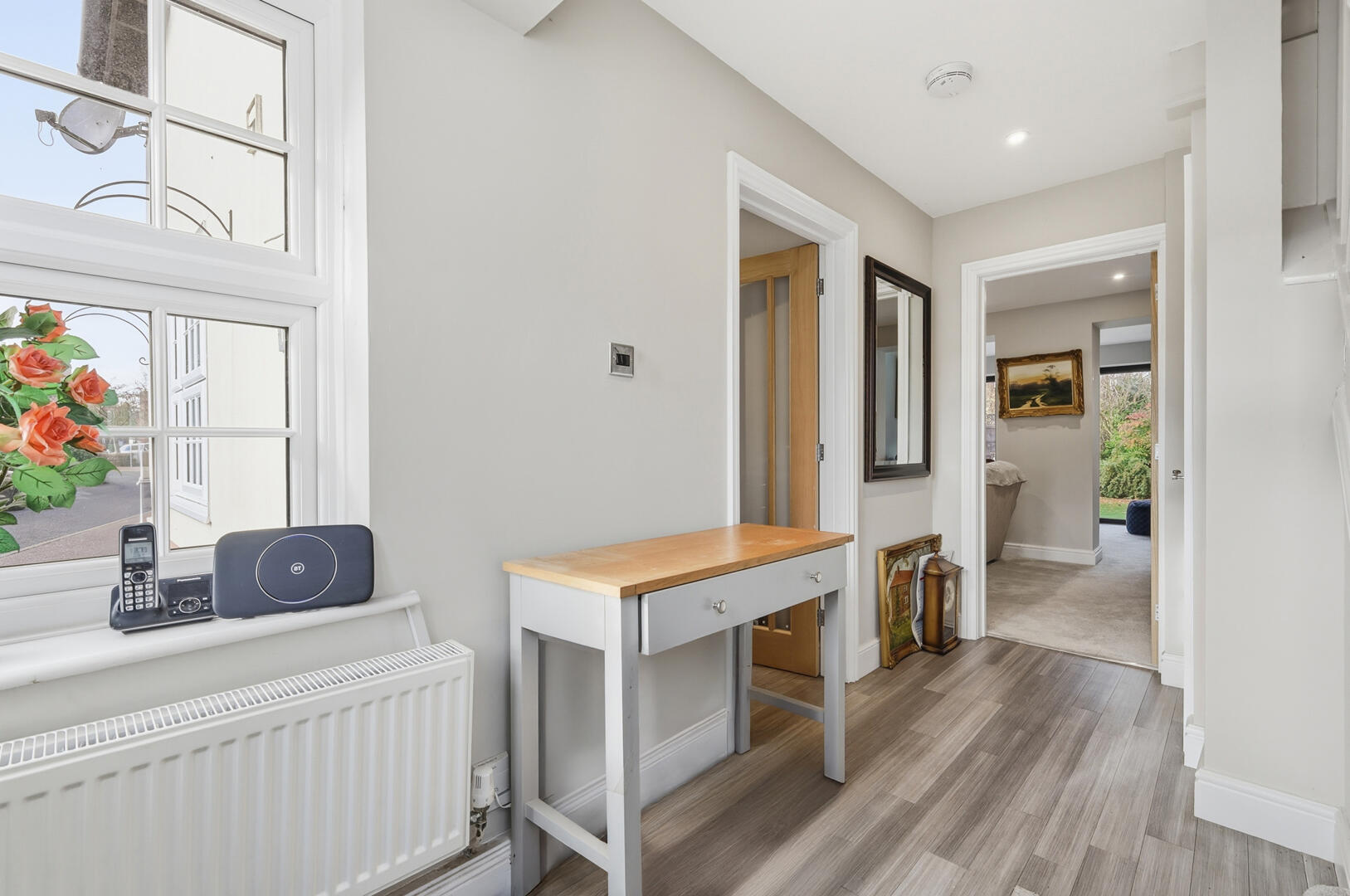 This welcoming entrance hall benefits from a window allowing natural light, with neutral walls and flooring that flows seamlessly into the rest of the ground floor. It provides access to the living areas and stairs to the first floor, creating a practical and inviting space to greet guests.